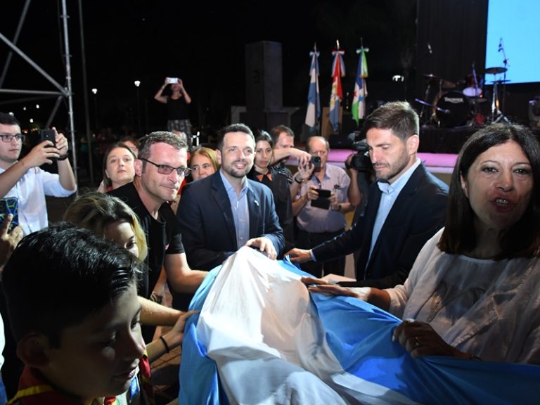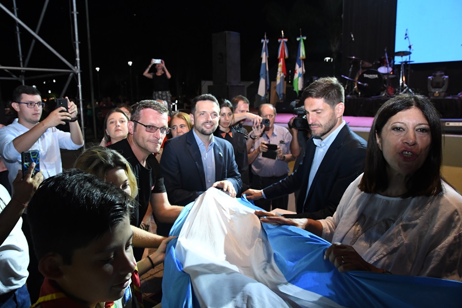 El acto protocolar contó con la entonación del Himno Nacional Argentino; el traslado de la gran bandera a la cual se le sumó el paño número 145, a cargo del Gobernador Maximiliano Pullaron; el Intendente Gonzalo Braidot; un representante de Bomberos voluntarios, de Scout Nº 317, de la Secretaría de Servicios Públicos y de Desarrollo Humano del Municipio, siendo algunos de los actores más importantes en la emergencia hídrica que estamos atravesando.