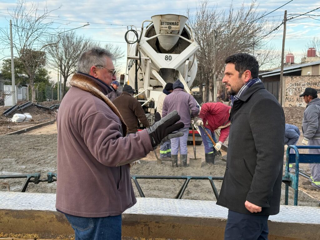 El intendente Gonzalo Braidot recorrió la obra junto a la secretaria de Planeamiento Territorial y Obras Públicas, Gisela Acosta, y destacó la importancia de esta intervención, especialmente por tratarse de una cuadra que pasa frente a la Esc. Provincial Nº 928 “Bernardino Rivadavia”. “Ya iniciamos el hormigonado de la primera cuadra y vamos a continuar hasta la Calle 111 para completar esta conexión vial tan esperada”, señaló Braidot.