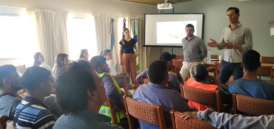 En el marco de las acciones de prevención del dengue, el Intendente Gonzalo Braidot junto al Secretario de Servicios Públicos mantuvieron una reunión, este lunes 6 de noviembre en el Salón Municipal de actos, con personal de la cartera municipal de Salud, Personal de maestranza y cooperativas de trabajo para coordinar y definir detalles del plan de trabajo para prevenir dicha enfermedad. La labor avanza a la par de concientización en las escuelas, del ejido urbano como el rural, así como con fumigaciones en los espacios verdes y escuelas.