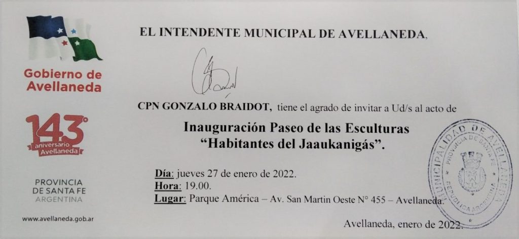 En el marco del 143° Aniversario de la fundación de Avellaneda, el Intendente Gonzalo Braidot invita a la comunidad a participar de la Inauguración del Paseo de las esculturas “Habitantes del Jaaukanigás”, que tendrá lugar este jueves 27 de enero a las 19hs en el Parque América, sita en Av. San Martín Oeste N° 455.