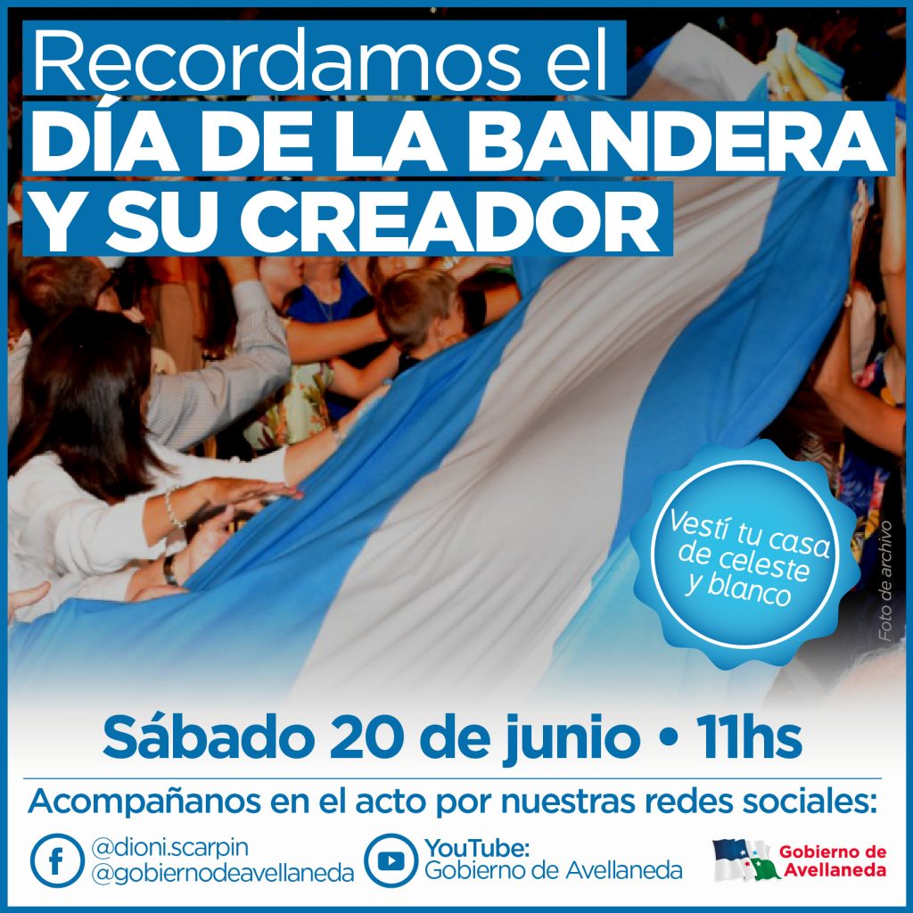 El Gobierno de Avellaneda invita a la comunidad a disfrutar y acompañar on line, el Acto conmemorativo por el Día de la Bandera y su creador. El mismo tendrá lugar el sábado 20 de junio a las 11hs y se transmitirá en directo, vía streaming, a través de las redes sociales oficiales y su canal de Youtube.