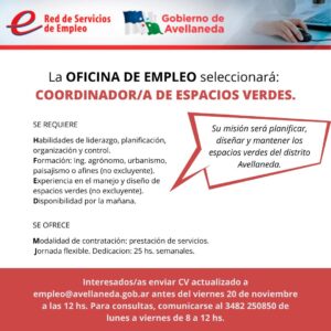 La Oficina de Empleo de Avellaneda seleccionará: COORDINADOR/A DE ESPACIOS VERDES. Su misión será planificar, diseñar y mantener los espacios verdes del distrito Avellaneda.