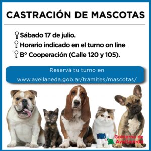 El Gobierno de Avellaneda informa que se encuentran a disposición de los vecinos de nuestra ciudad, los turnos para castrar mascotas este sábado 17 de julio en el NIDO de B° Cooperación (Calle 120 y 105), debiendo solicitarlos ingresando a www.avellaneda.gob.ar/tramites/mascotas/