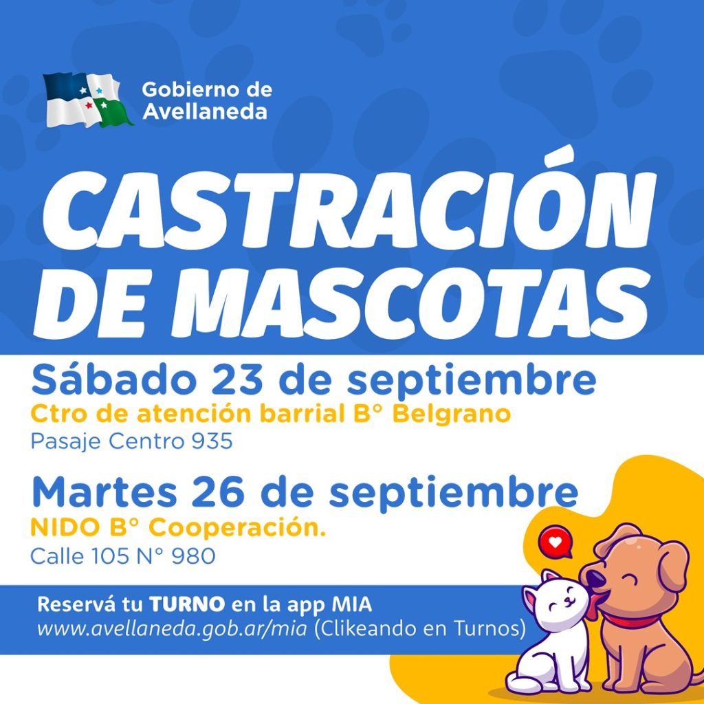 El Gobierno de Avellaneda informa que se encuentra habilitado el turnero para las castraciones gratuitas de mascotas que tendrán lugar: