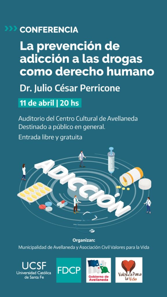 El Gobierno de Avellaneda junto a la Asociación Civil Valores para la vida invitan a participar de la conferencia “La prevención de adicción a las drogas como derecho humano” a cargo del Dr. Julio César Perricone* que tendrá lugar el jueves 11 de abril a las 20hs en el Auditorio del Centro Cultural Municipal de Avellaneda.