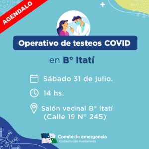 En el marco de los operativos de testeos para la detección de COVID, el Gobierno de Avellaneda realizará el sábado 31 de julio a las 14 hs en el Salón vecinal de B° Itatí (Calle 19 N° 245), hisopados a todas aquellas personas que presenten síntomas compatibles con la enfermedad.