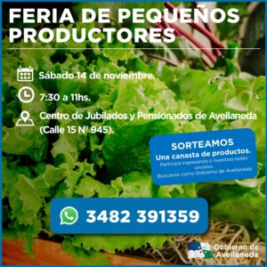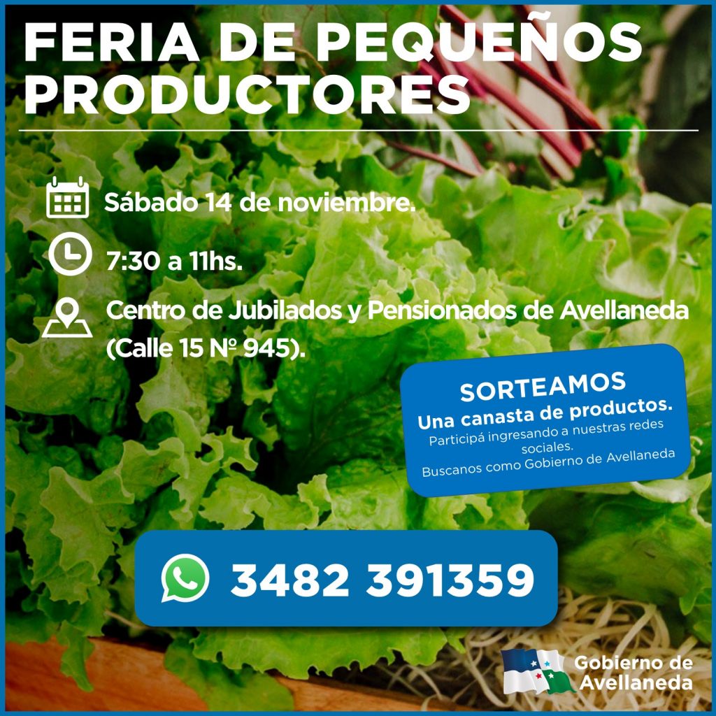 El Gobierno de Avellaneda y los pequeños productores invitan a participar de la Feria, que tendrá lugar este sábado 13 de noviembre, de 7,30 a 11hs en el Centro de Jubilados y Pensionados de esta ciudad (Calle 15 Nº 945).