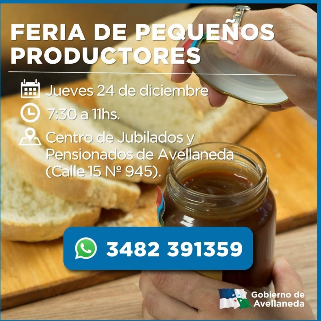 El Gobierno de Avellaneda y los pequeños realizan, hoy jueves 24 de diciembre, su tradicional Feria. Te esperamos de 7,30 a 11hs en el Centro de Jubilados y Pensionados de esta ciudad (Calle 15 Nº 945).