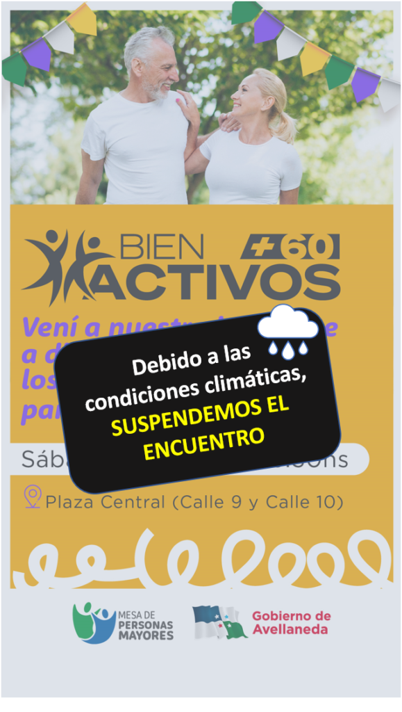El Gobierno de Avellaneda y la Mesa de Personas Mayores informan que, debido a las condiciones climáticas adversas, se suspendió la kermesse prevista para adultos, a partir de los 60 años, y que tendría lugar hoy sábado 13 de abril en la Plaza Central.