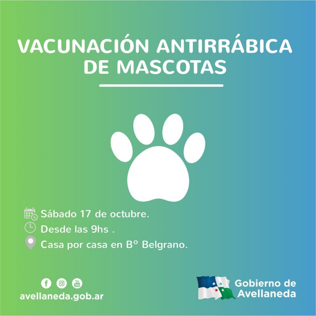 En la continuidad del programa “Mascotas sanas, familias felices”, el Gobierno de Avellaneda vacunará contra la rabia a perros y gatos este sábado 17 de octubre desde las 9hs, bajo la modalidad casa por casa en Bº Belgrano.