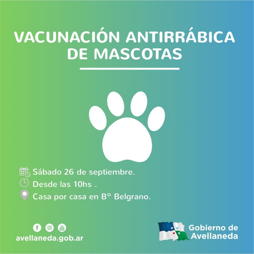En la continuidad del programa “Mascotas sanas, familias felices”, el Gobierno de Avellaneda vacunará contra la rabia a perros y gatos este sábado 26 de septiembre desde las 10hs, bajo la modalidad casa por casa en B° Belgrano.