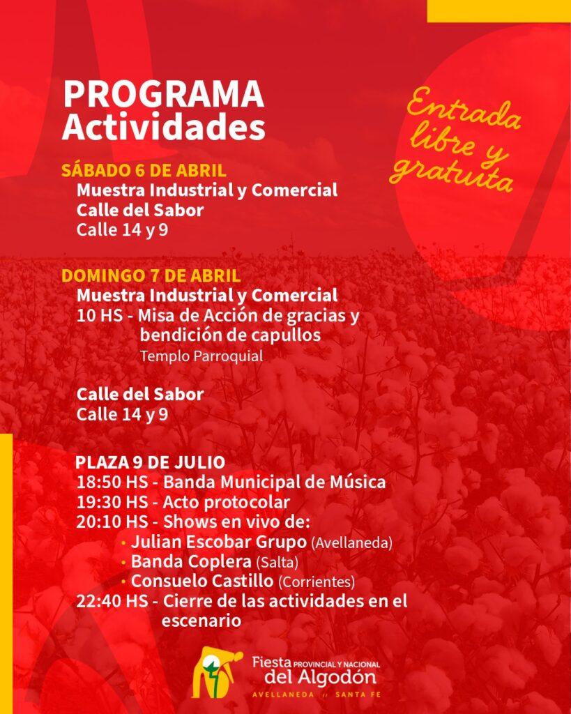 El Gobierno de Avellaneda y la Unión Agrícola de Avellaneda hacen extensiva la invitación a los vecinos de toda la región a participar, este sábado 6 y domingo 7 de abril, de la Fiesta del Algodón, edición 2024 en la Plaza Central de esta ciudad.