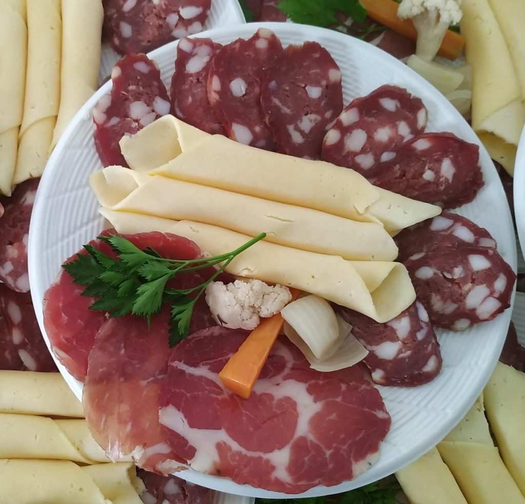 El menú consiste en tabla de salames caseros y quesos; polenta con chorizos, y costillas de cerdo con ensaladas. No incluye bebidas. Llevar cubiertos.