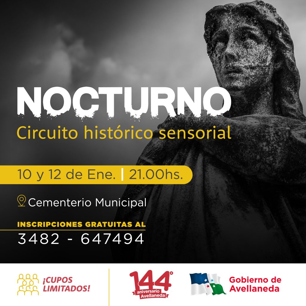 En el marco de un nuevo cumpleaños de Avellaneda, el Gobierno de la ciudad invita a los interesados, a partir de los 16 años de edad, participar de “Nocturno”, un circuito histórico sensorial por el Cementerio Municipal.
