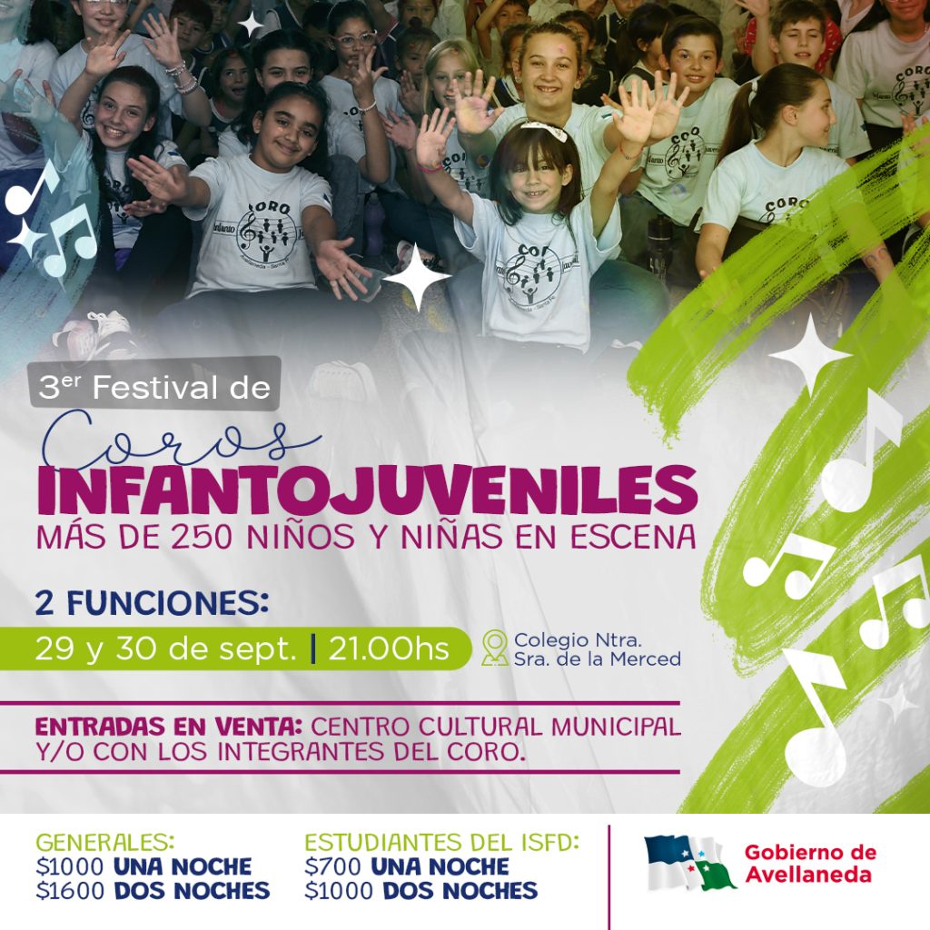 El Gobierno de Avellaneda invita a la comunidad a participar del 3er Festival de Coros infantojuveniles que tendrá lugar durante el viernes 29 y el sábado 30 de septiembre a las 21hs en el Colegio Nuestra Sra de la Merced.