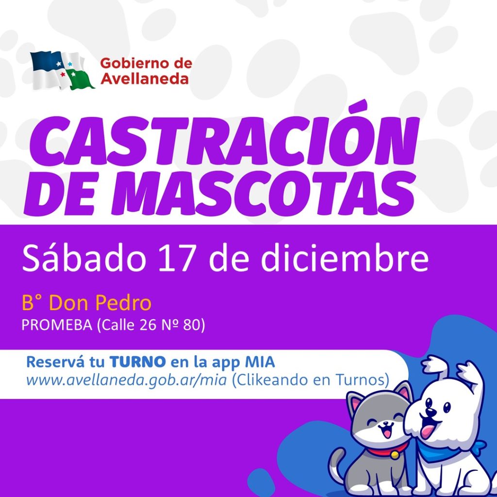El Gobierno de Avellaneda informa que se encuentra habilitado el turnero para castración de mascotas prevista para este sábado 17 de diciembre en el PROMEBA de B° Don Pedro (Calle 26 N° 80).