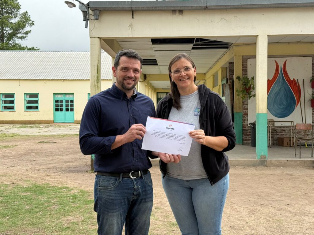 El Intendente Gonzalo Braidot visitó la EESO N° 717, donde fue recibido por su Directora, Verónica Della Rosa, para hacer entrega de nuevos Fondos para la Atención de Necesidades Inmediatas (FANI), otorgados por el Gobierno de la Provincia de Santa Fe, destinados a la compra de equipos de aire acondicionado para la institución.