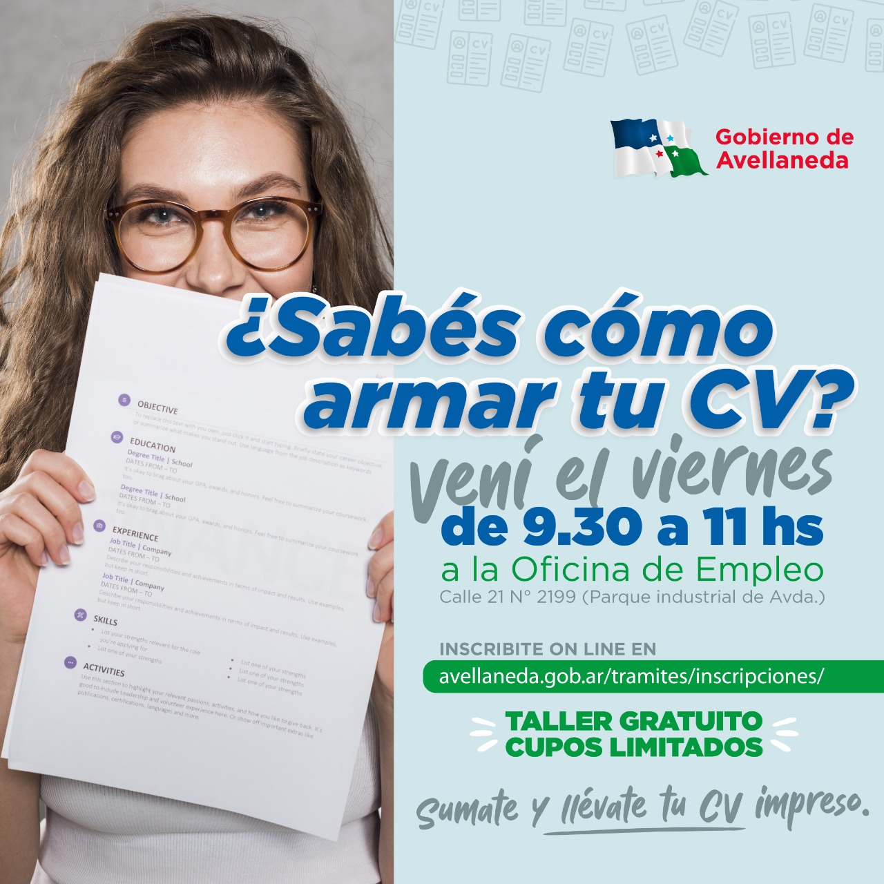 El Gobierno de Avellaneda invita a los interesados a participar del Taller en el que aprenderás a armar tu Currículum Vitae (CV) un instrumento fundamental a la hora de buscar trabajo.