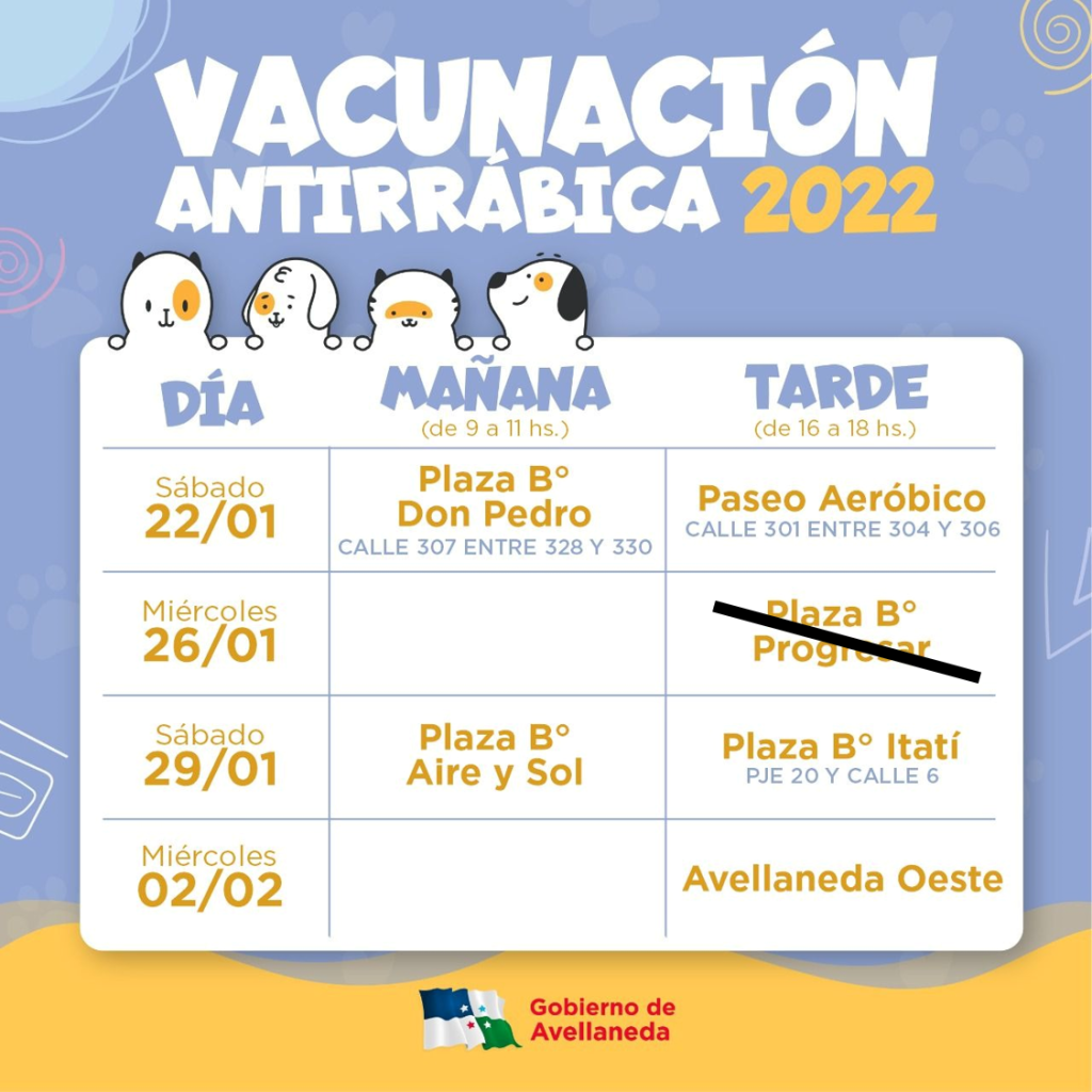 El Gobierno de Avellaneda informa que, debido a las lluvias, se suspende hasta nuevo aviso, la vacunación antirrábica de mascotas prevista para hoy miércoles 26 de enero en la plaza de B° Progresar.