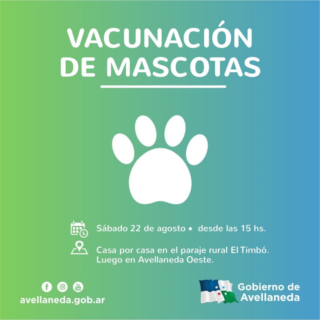 En el marco del programa “Mascotas sanas, familias felices”, el Gobierno de Avellaneda vacunará, contra la rabia, a perros y gatos el sábado 22 de agosto a las 15hs en los domicilios particulares de los vecinos del paraje rural El Timbó.
