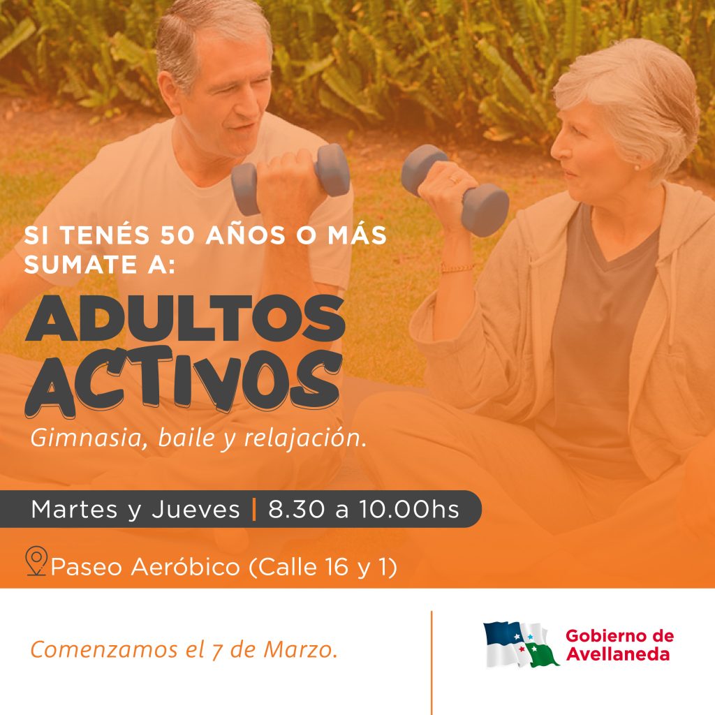 El Gobierno de Avellaneda y la Mesa de personas mayores invitan a todos aquellos vecinos y vecinas a partir de los 50 años a sumarse a la propuesta saludable y recreativa “Adultos activos” cuyos encuentros tendrán lugar a partir del martes 7 de marzo en el Paseo aeróbico (Calle 1 y 16).