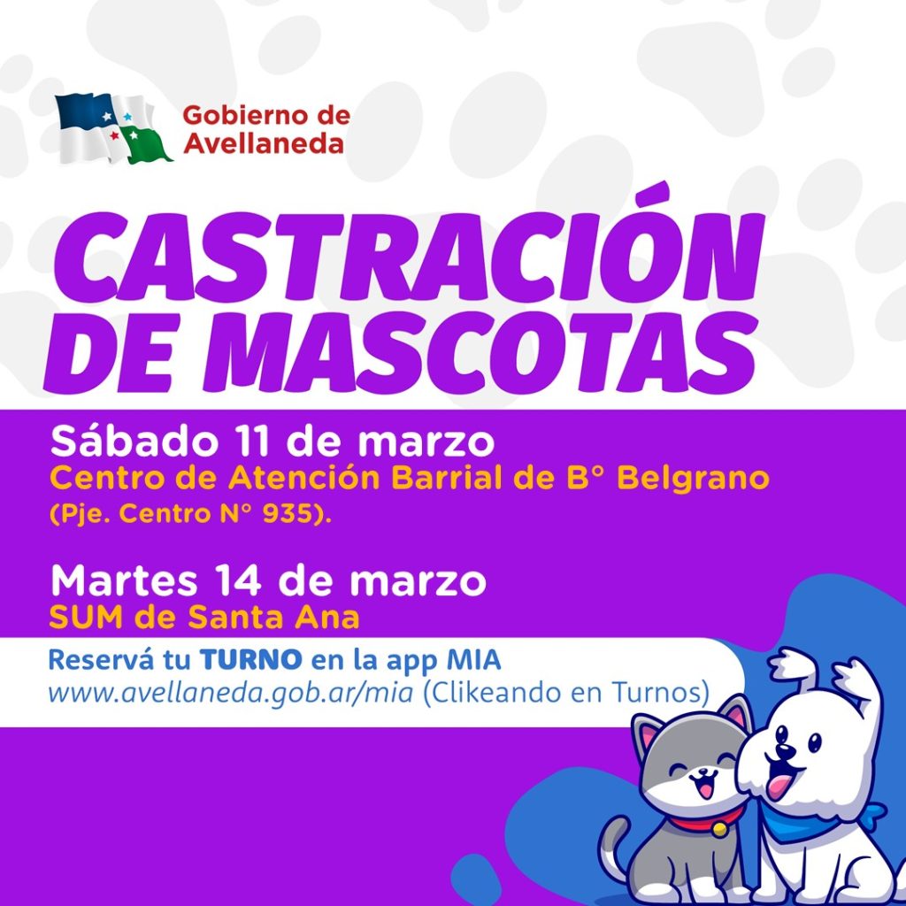 En este sentido, el turnero on line ya se encuentra habilitado en www.avellaneda.gob.ar/mia (Clikeando en Turnos) para las prácticas de castración en los siguientes días y lugares: