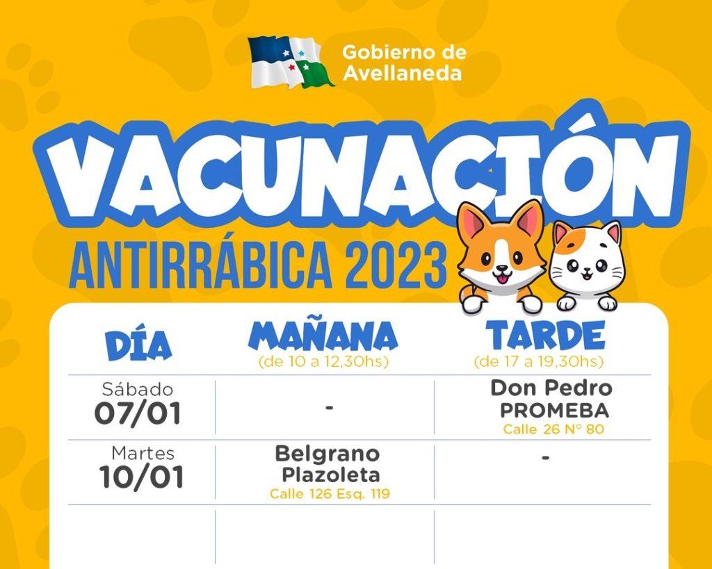 El Gobierno de Avellaneda informa a los vecinos que, este sábado 7 de enero, se aplicarán vacunas antirrábicas a mascotas en el Salón PROMEBA ubicado en B° Don Pedro (Calle 26 N° 80), en el horario de 17 a 19,30hs.