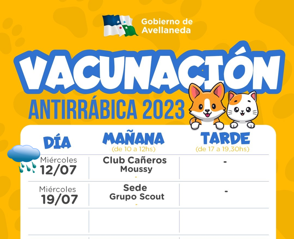 El Gobierno de Avellaneda informa a la comunidad y especialmente a los vecinos de Moussy que, debido a las condiciones del clima, la vacunación de mascotas prevista para hoy miércoles 12 de julio en el Club Cañeros, se pospone para el viernes 14 de 10 a 12hs en el mismo lugar.